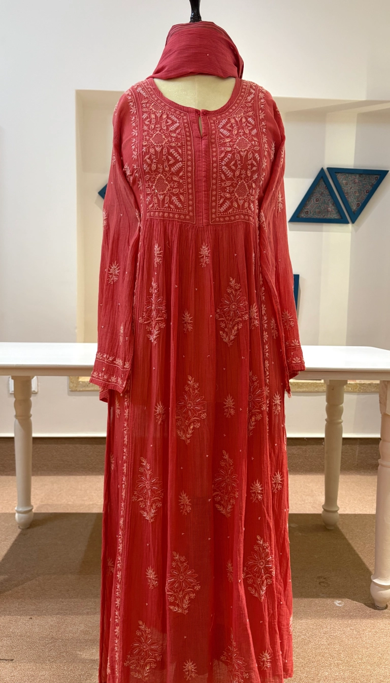 Handcrafted Chikankari on rich crimson mul chanderi—each thread telling a story of artistry, patience, and timeless elegance.