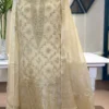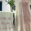 Elegant and ethereal, this powder blue mul chanderi suit set is adorned with handcrafted Chikankari featuring intricate jaal work and a refined central panel of floral vines. The delicate ivory threadwork creates a soft, graceful contrast, complemented by a sheer dupatta with subtle zari accents. A timeless expression of modern pastel luxury for elevated festive occasions.