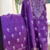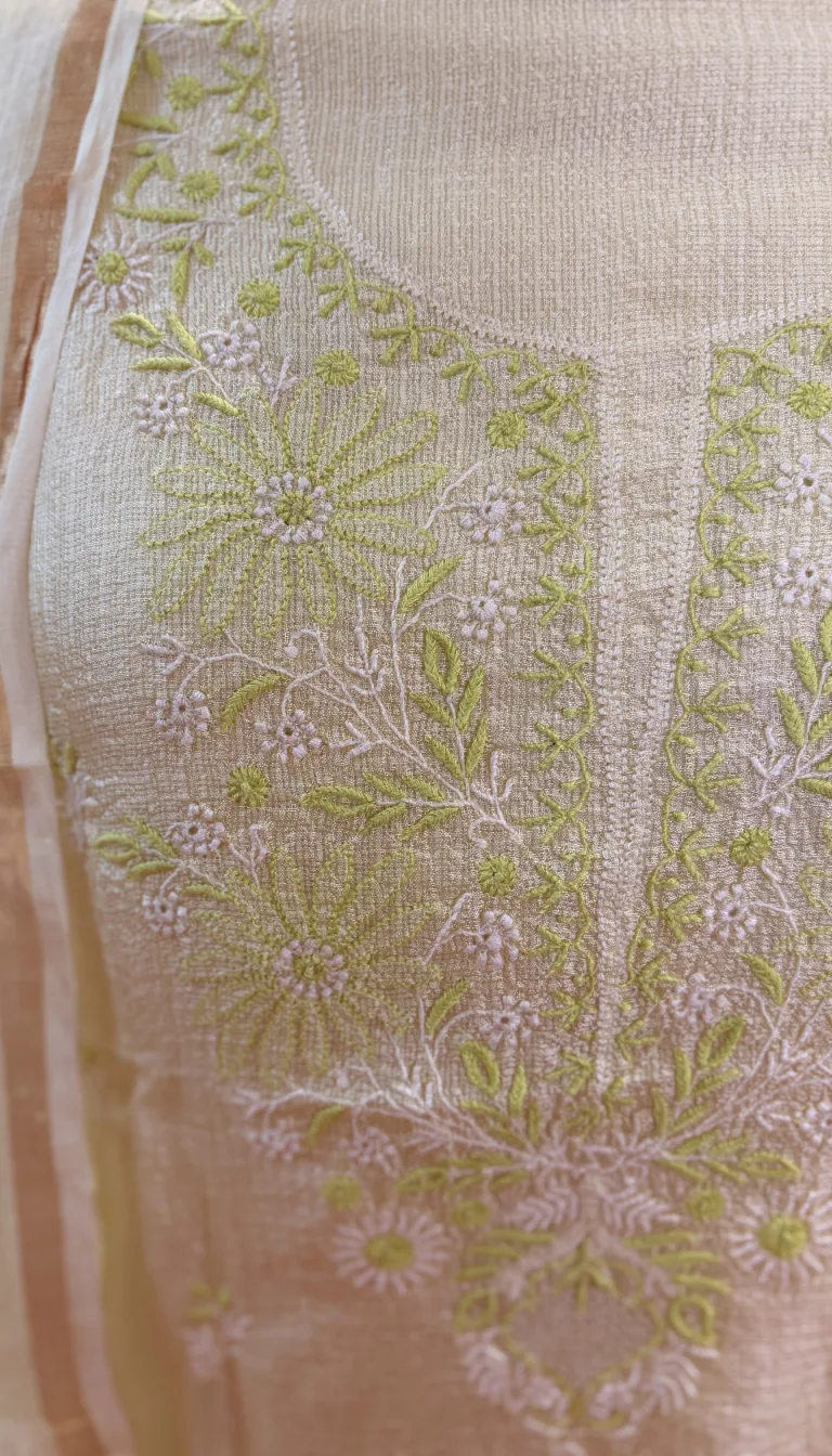Radiating soft elegance, this butter yellow doriya silk 2-piece set is adorned with delicate hand-embroidered Chikankari featuring graceful floral motifs and subtle butis. Paired with a sheer dupatta finished in a refined border, this ensemble captures effortless sophistication—perfect for sunlit celebrations and timeless daywear.
