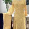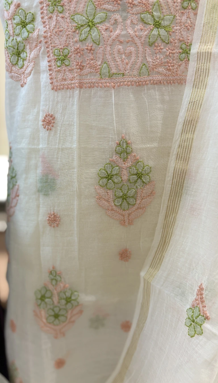 Light, elegant, and effortlessly refined, this ivory mul chanderi 2-piece set showcases delicate hand-embroidered Chikankari with soft pink and pista floral motifs. Accentuated with intricate neckline detailing and a sheer dupatta finished with subtle zari borders, this ensemble embodies timeless summer luxury and graceful femininity.