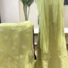 A celebration of soft femininity, this pastel mint georgette 3PC suit set features an all-over floral jaal in delicate blush and sage tones. Crafted with fine, chikankari-inspired embroidery, the ensemble is paired with a sheer dupatta adorned with subtle floral accents. Light, graceful, and effortlessly elegant—perfect for refined festive and daytime occasions.