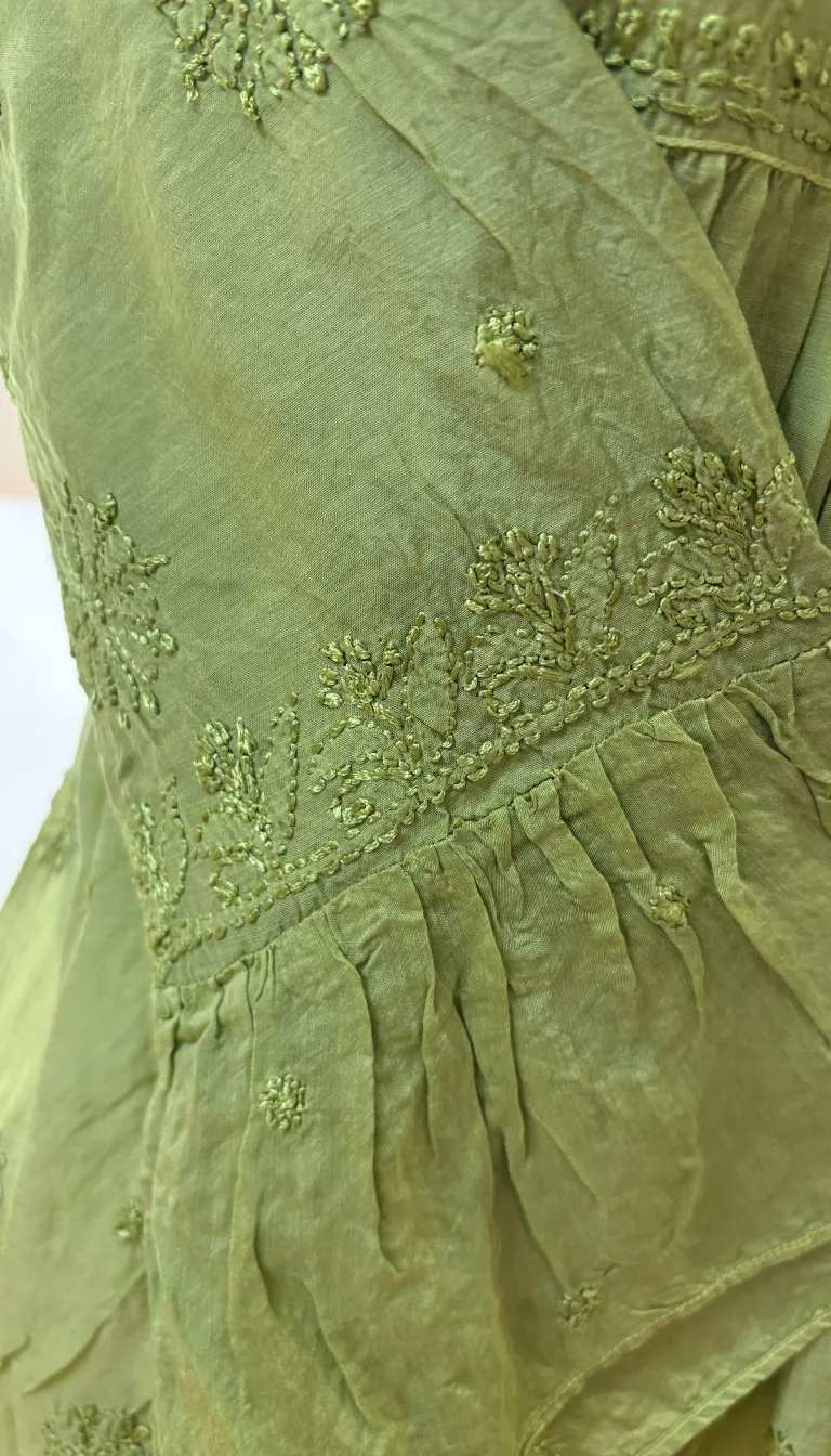 A breezy pistachio green muslin top in size 44, adorned with delicate handwork Chikankari embroidery. Featuring elegant floral butis, a finely detailed yoke with subtle button accents, and a soft flared silhouette, this piece blends comfort with understated sophistication—perfect for effortless everyday luxury.