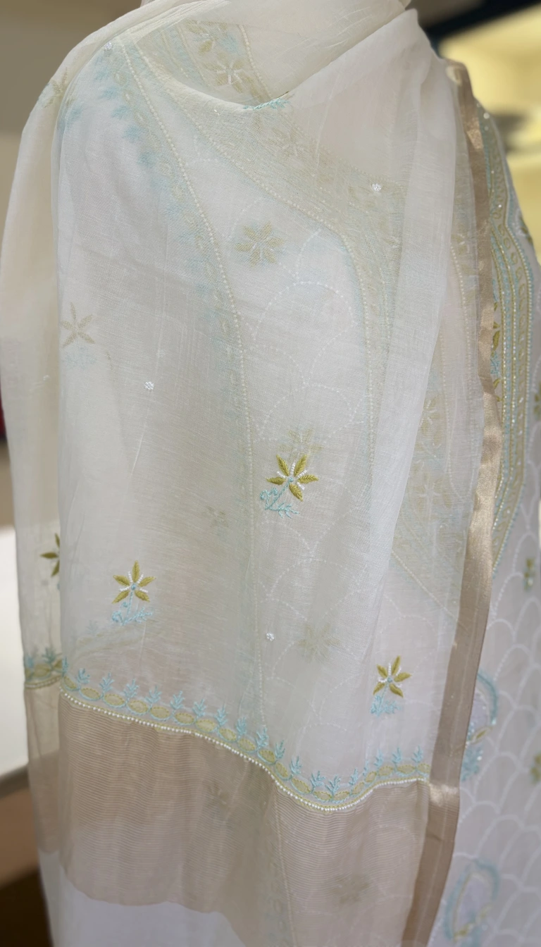 Ivory Aqua Pearl Chikankari Mul Chanderi Unstitched Suit Set