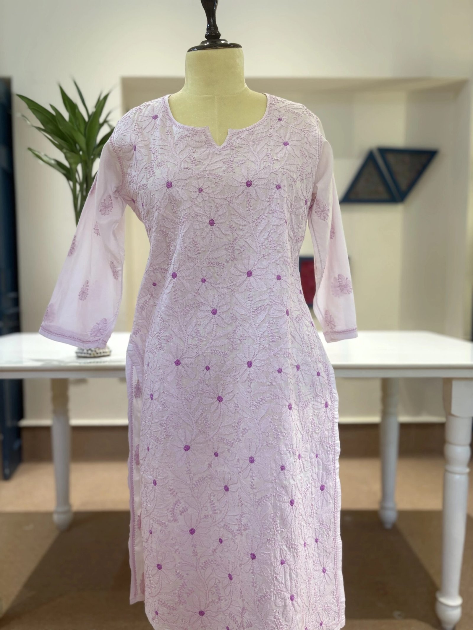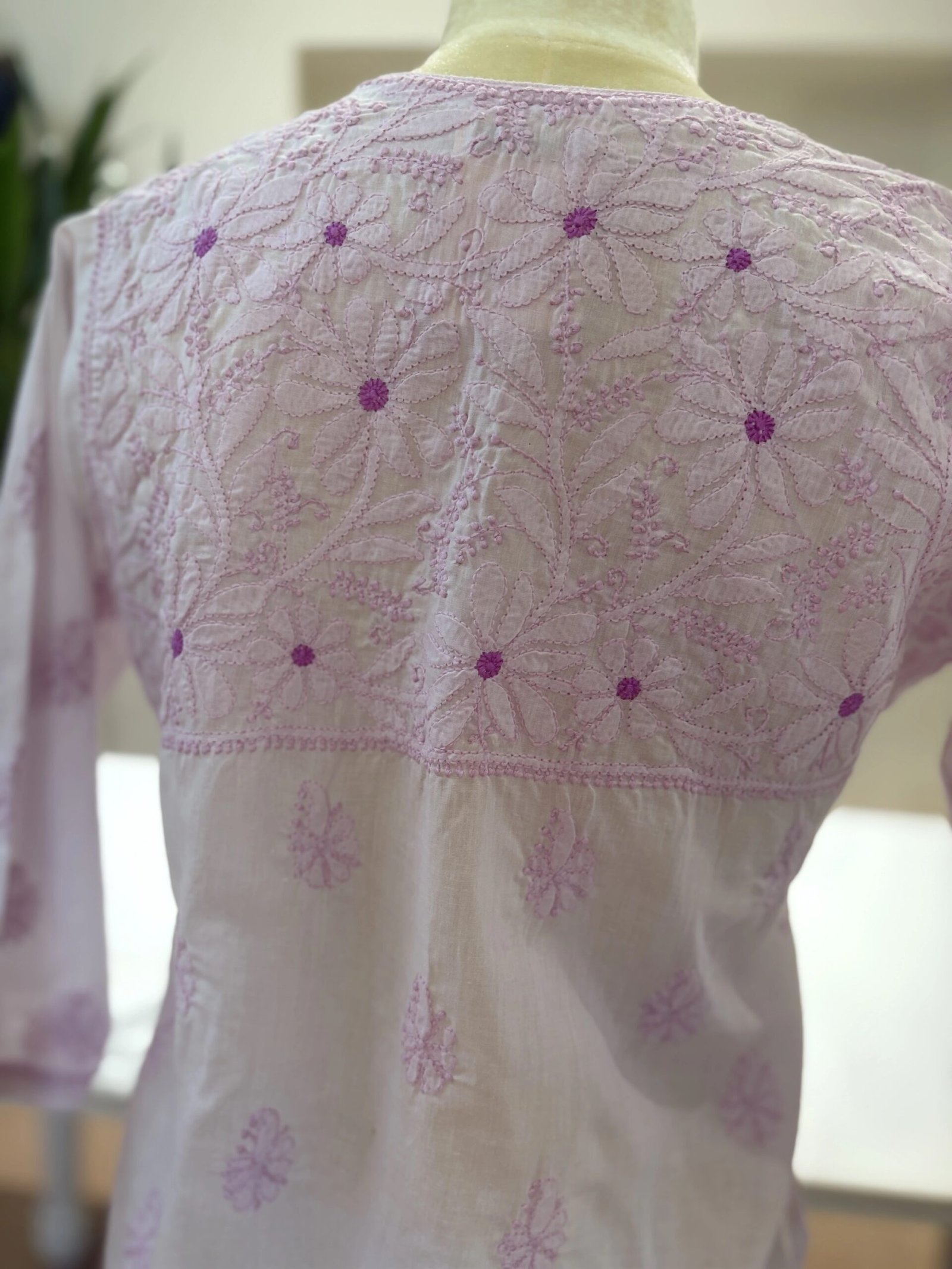 Elegant and timeless, this ivory cotton kurti features exquisite handwork chikankari in a dual-tone palette of blush pink and lavender. Adorned with statement floral motifs and intricate vine detailing, it offers a refined blend of softness and sophistication—perfect for elevated everyday wear.
