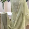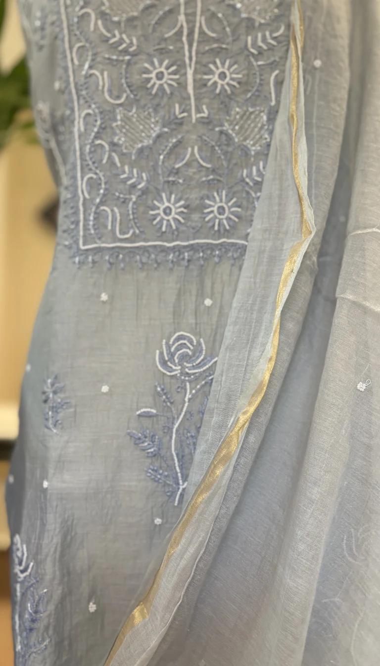 Ethereal in gray, this Mul Chanderi unstitched suit set showcases exquisite handworked Chikankari enhanced with delicate pearl embellishments. Paired with a sheer dupatta edged in a subtle zari border, it embodies effortless elegance and timeless sophistication for refined occasions.