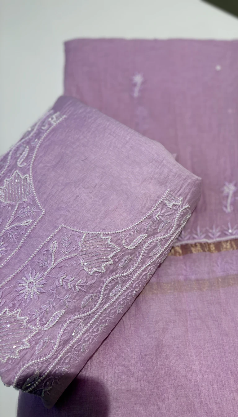 Ethereal and timeless, this powder lilac ensemble captures the essence of refined elegance with intricate handcrafted Chikankari, delicately enhanced with pearl and cutdana embellishments. Crafted in airy Mul Chanderi, it is designed for effortless grace and understated luxury.