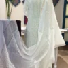 A vision of understated elegance, this powder blue unstitched set is adorned with intricate hand Chikankari in a graceful jaal pattern. Crafted in lightweight mul chanderi, it blends timeless artistry with a refreshing contemporary palette—perfect for effortless sophistication.