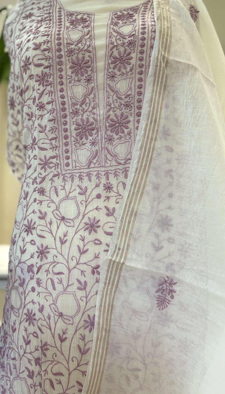 Mauve Ivory Jaal Chikankari Mul Chanderi Set