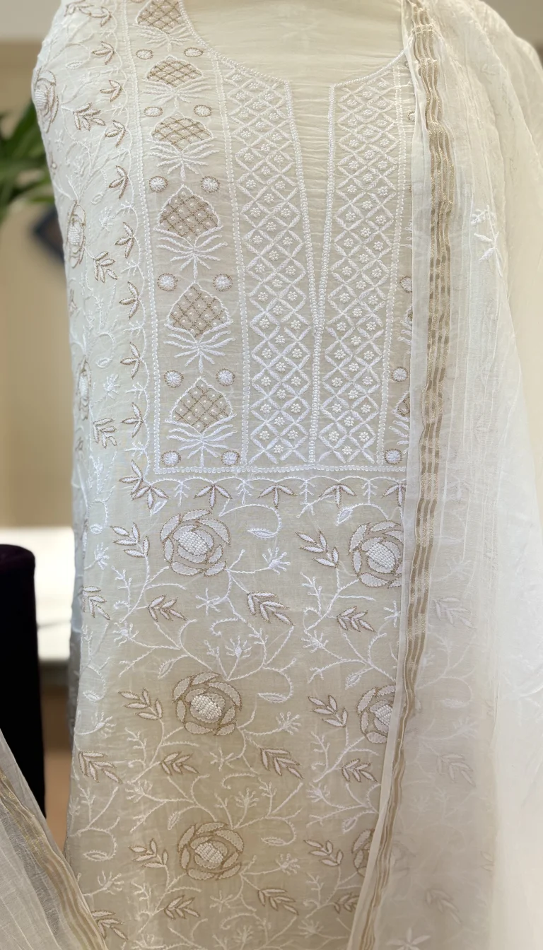 Ivory Rose Jaal Chikankari Mul Chanderi Set