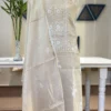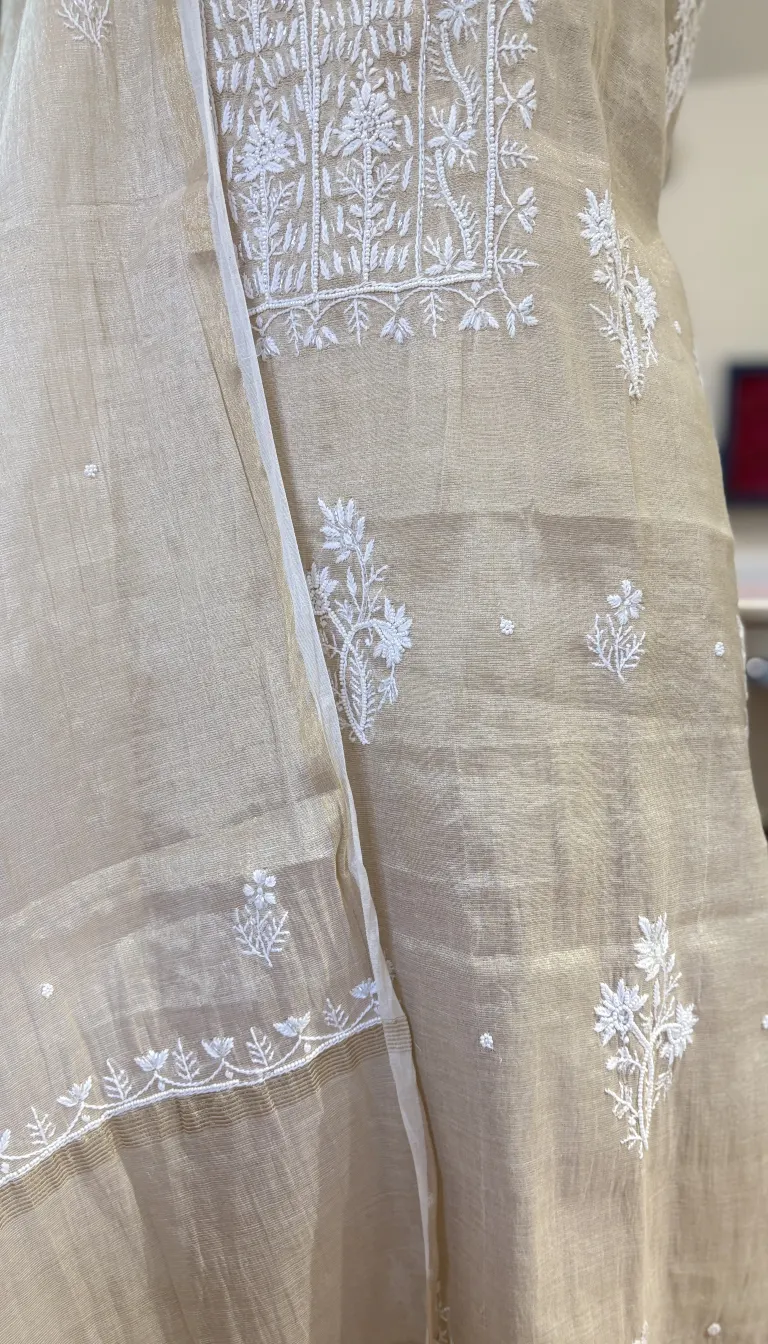 Radiating understated opulence, this tissue Chikankari set is adorned with intricate hand embroidery and delicate pearl accents. Crafted on a luminous dyeable base, it offers a perfect canvas for bespoke festive styling with timeless elegance.
