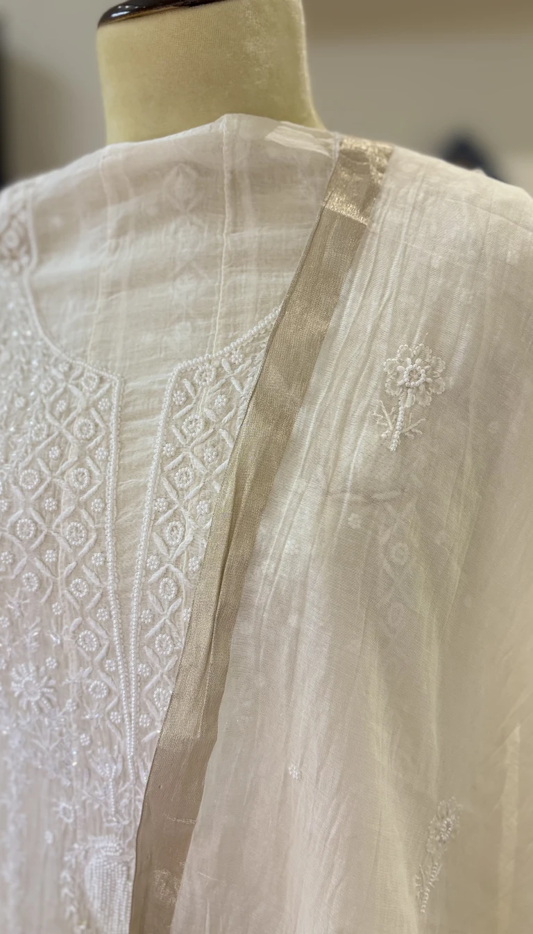 Ivory Chikankari Mul Chanderi Anarkali Set