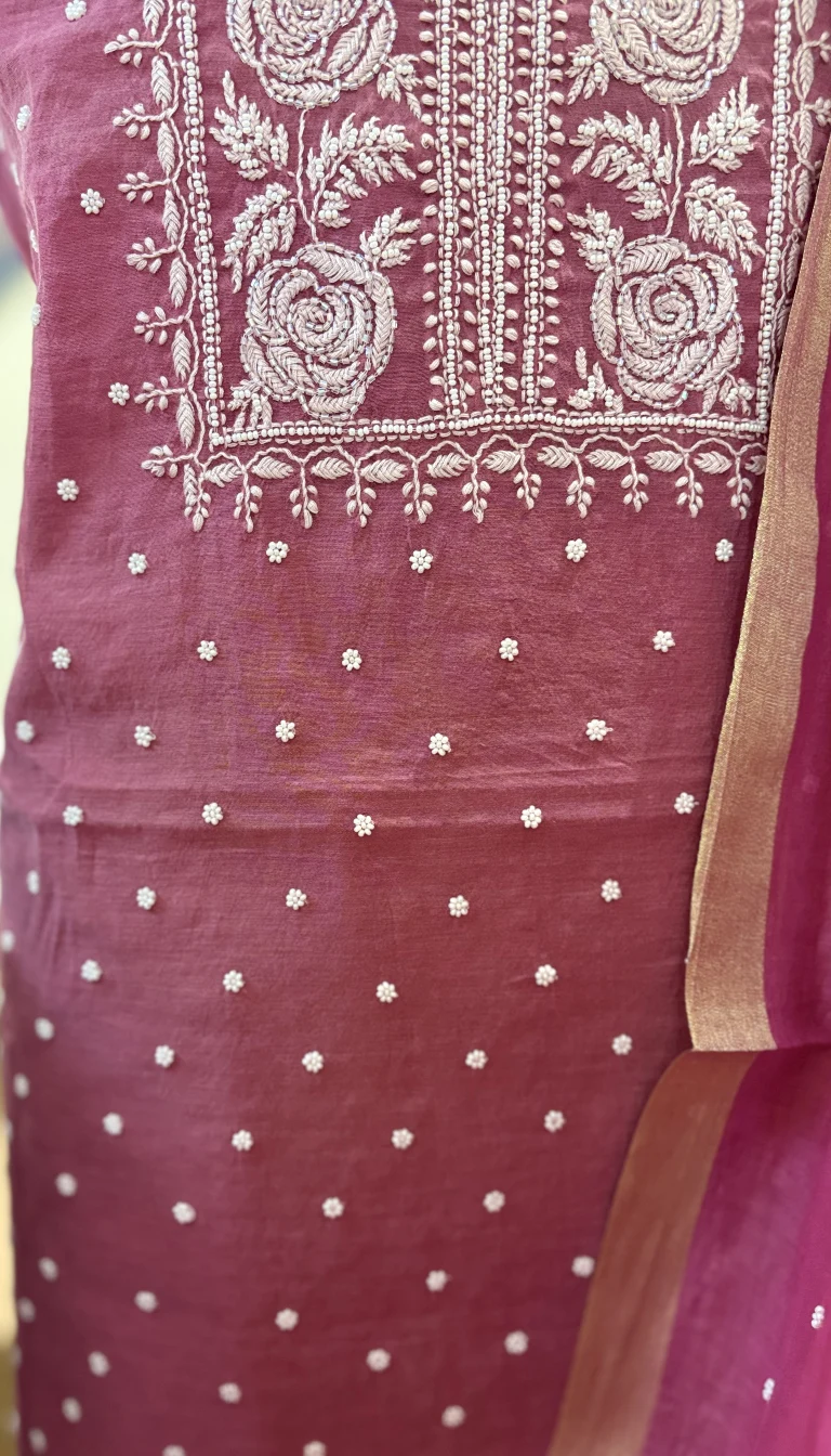 Rose Wine Pearl Mul Chanderi Chikankari Set
